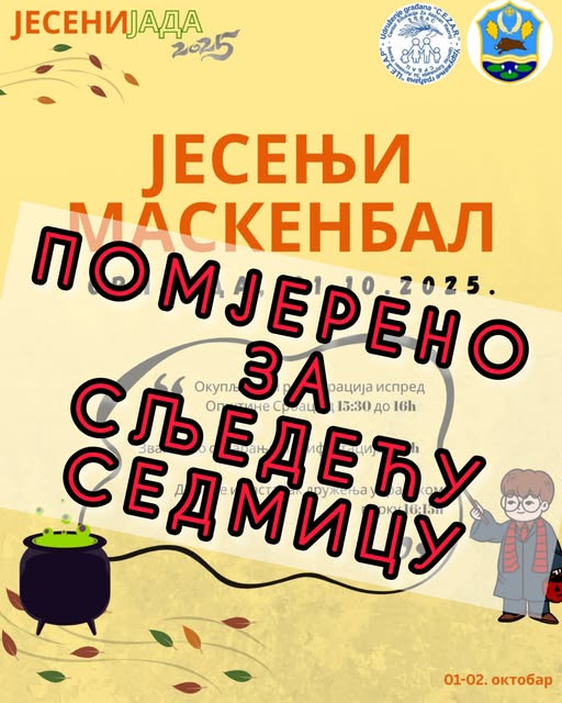 Maskenbal, koji se tradicionalno održava u okviru manifestacije “Jesenijada”, biće pomjeren za narednu sedmicu. O novom terminu održavanja, “C.E.Z.A.R.” će blagovremeno obavijestiti javnost putem sredstava javnog informisanja.
