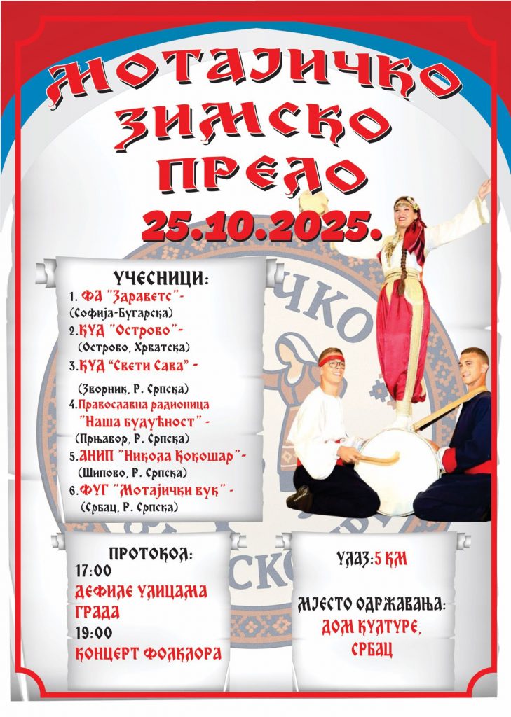 Folklorno udruženje građana ,,Motajički vuk” Sitneši organizuje međunarodnu smotru folklora ,,Motajičko zimsko prelo” koja će biti održana sutra, 25. oktobra, u Domu kulture ,,Uglješa Kojadinović” Srbac sa početkom u 19 časova.