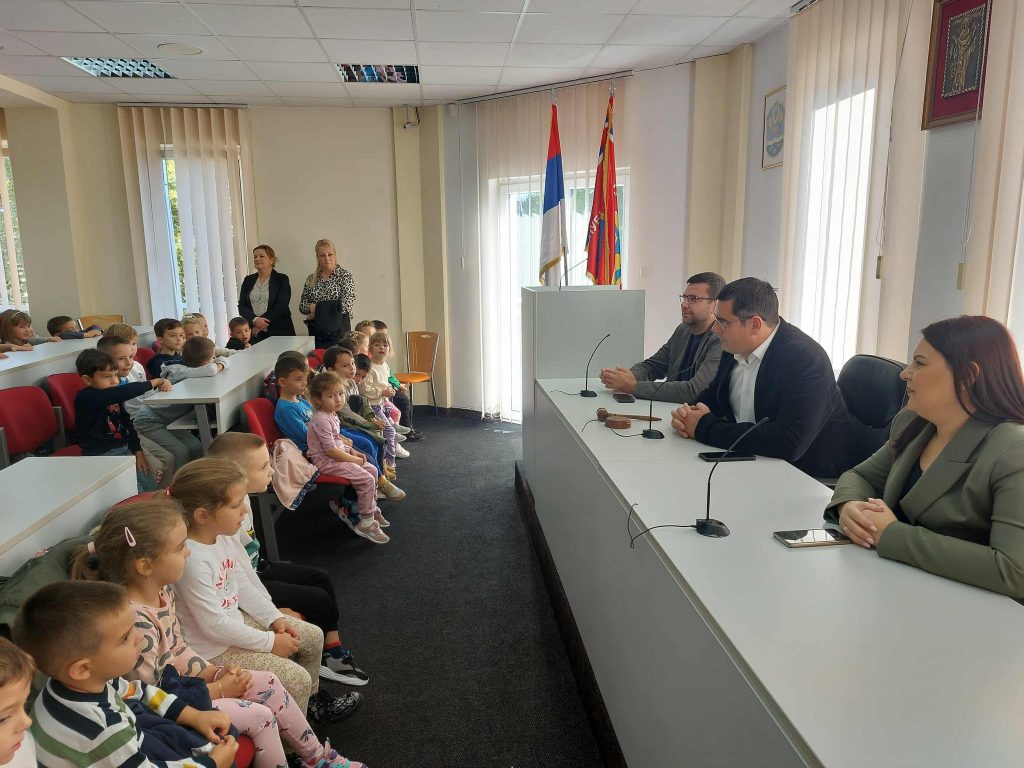 Polaznici Dječijeg vrtića ,,Naša radost” Srbac u pratnji direktorice Bogdane Miholjčić i vaspitačica ove predškolske ustanove posjetili su danas Skupštinu opštine, gdje su ih dočekali predsjednik lokalnog parlamenta Dejan Dević i sekretar Skupštine Srđan Brkić.