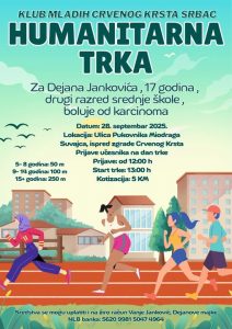 Klub mladih Crvenog krsta Srbac organizuje humanitarnu trku za prikupljanje sredstava za liječenje Dejana Janković. ,,Trka za život Dejana Janković” biće organizovana u nedjelju, 28.septembra, u ulici pukovnika Miodraga Suvajac, a prijavljivanje za trku je na sam dan trke od 12.časova, ispred zgrade Crvenog krsta Srbac, gdje će se odmah